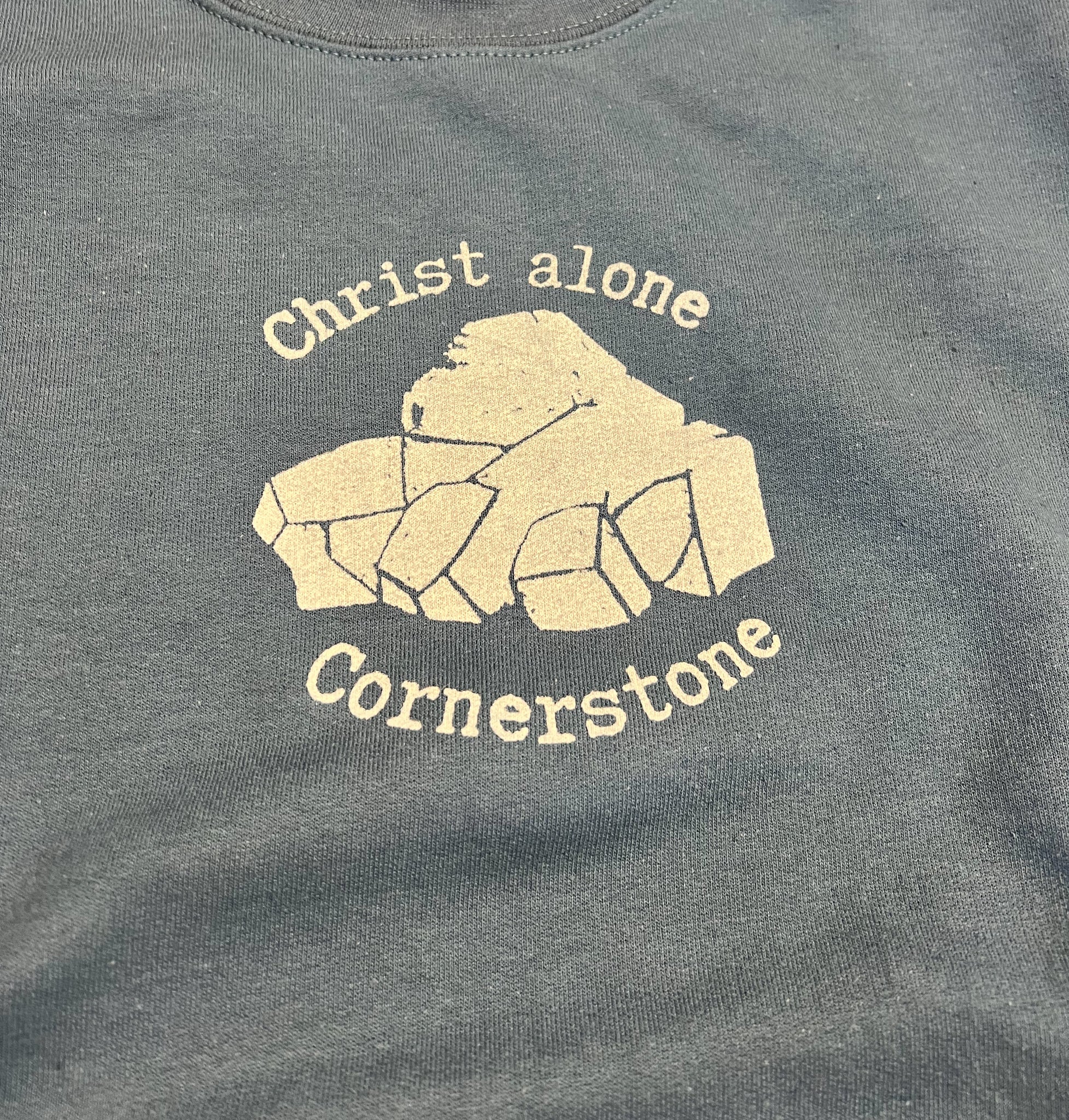 This indigo blue sweatshirt has a declaration that Christ alone is our Cornerstone.