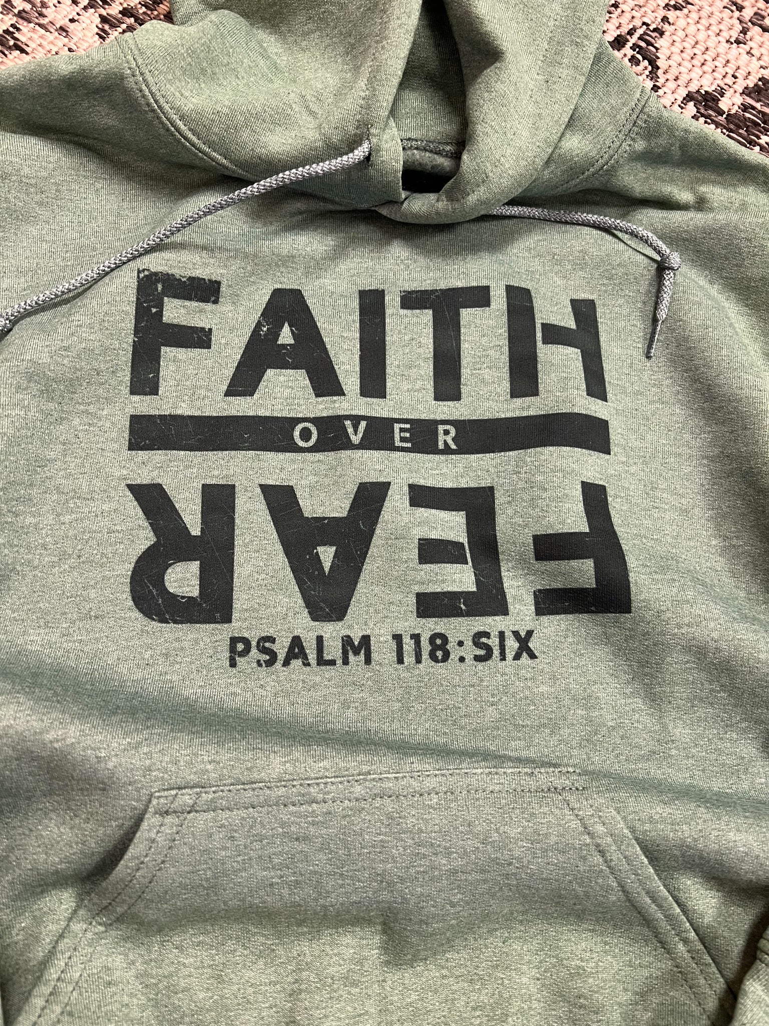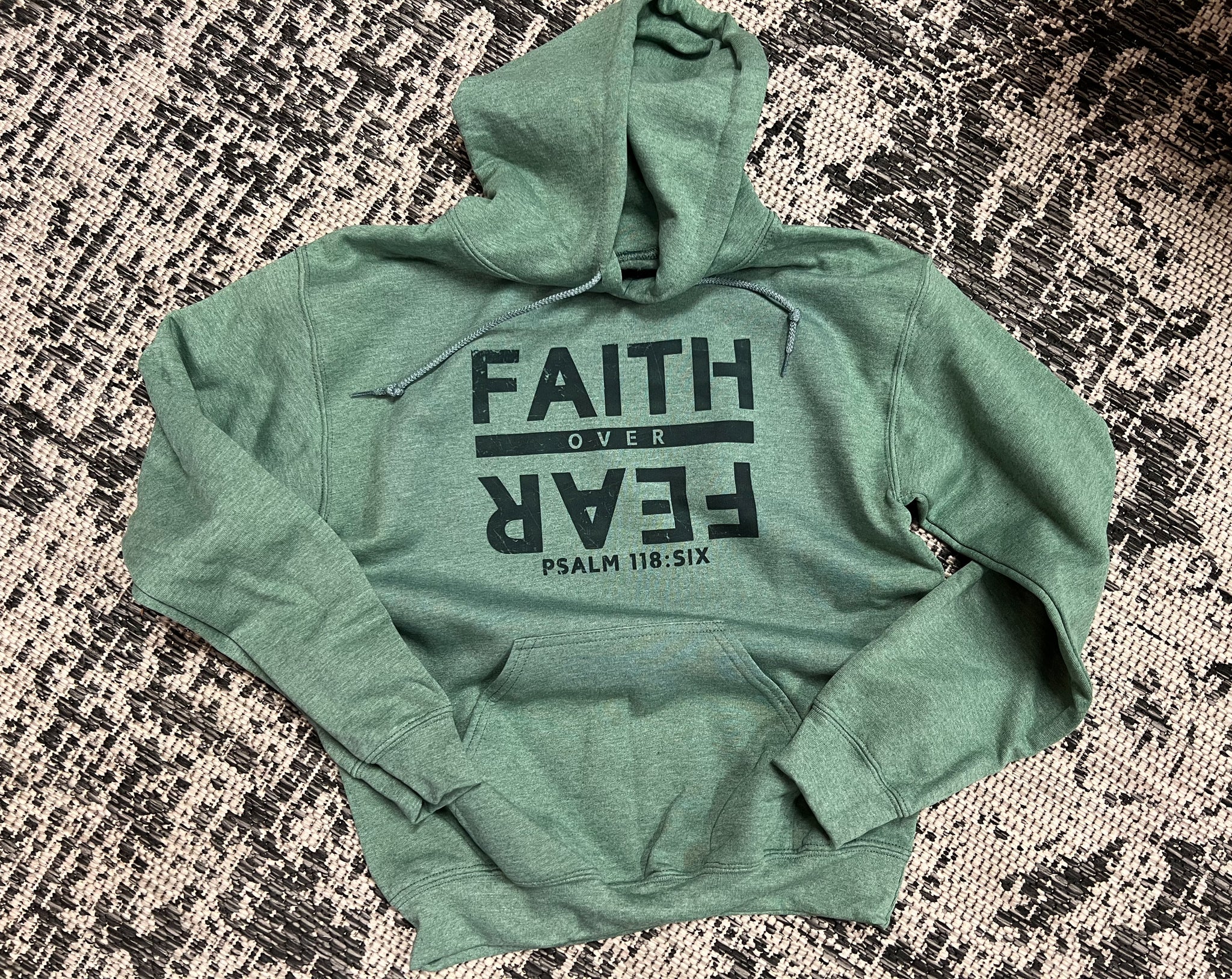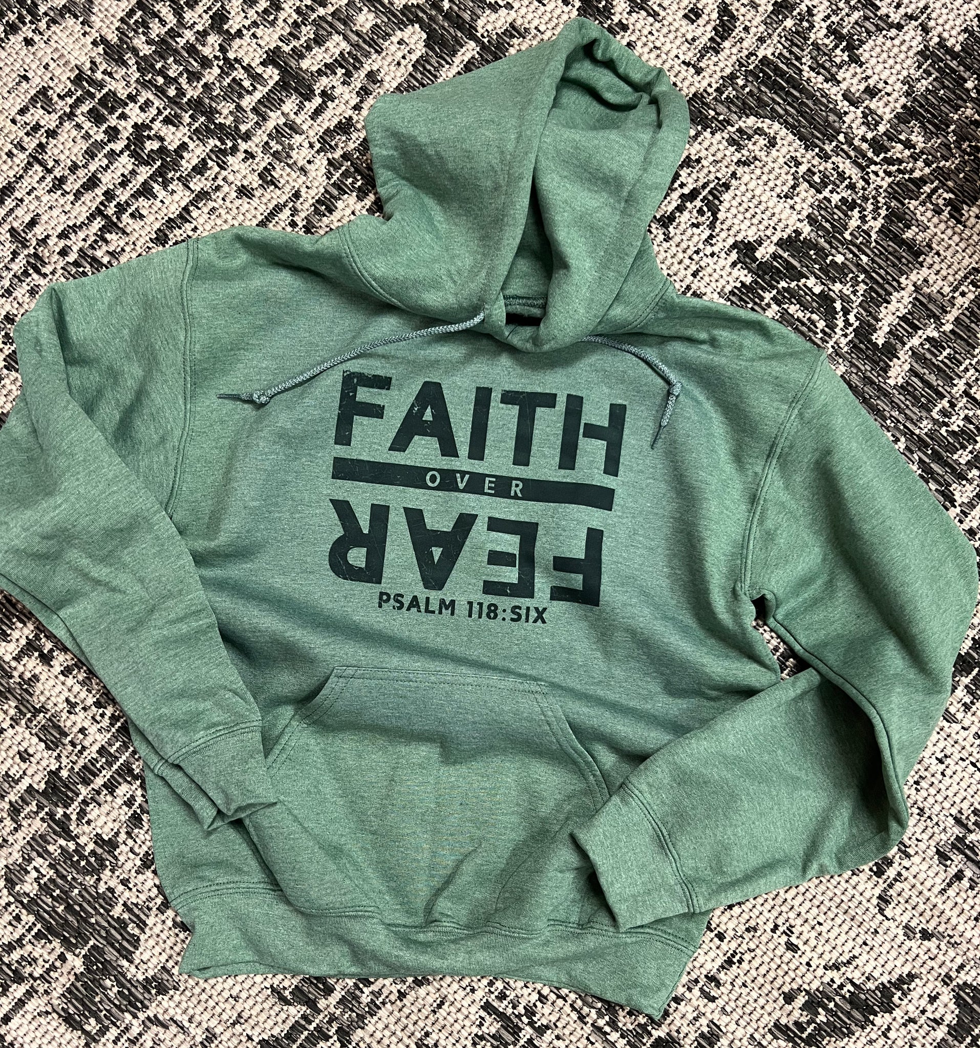 Unisex fit; true to size; 50/50 blend; heather green with black print.