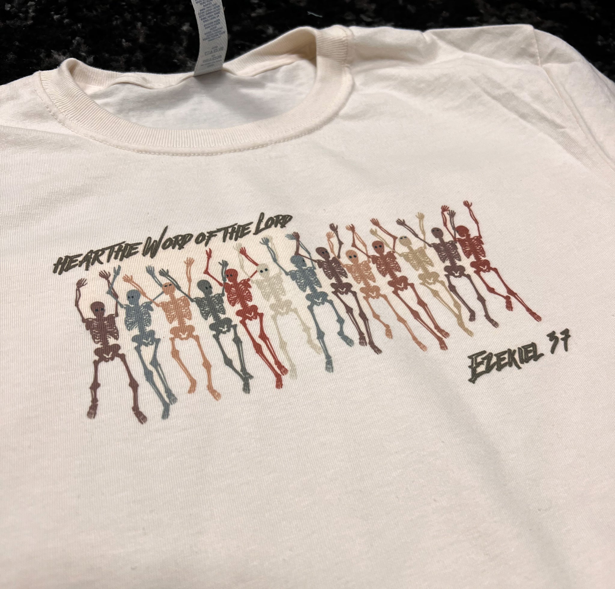 Unisex fit; true to size; sweet cream tee color with neutral tone print.