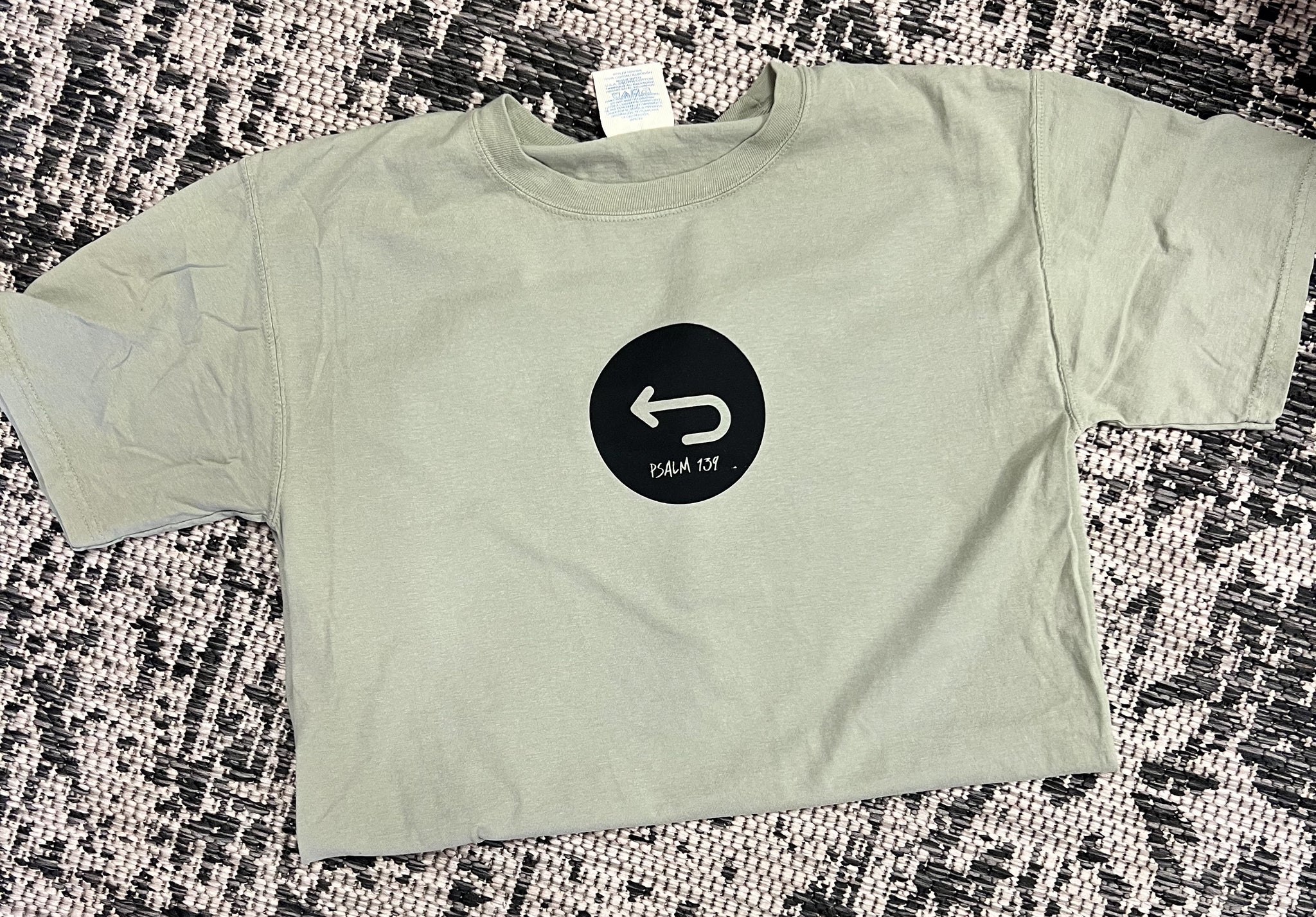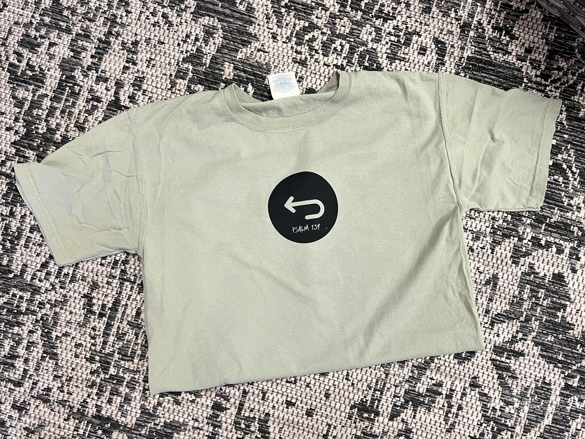 Unisex fit; true to size; 100% cotton; faded fatigue tee with black silkscreen front (circle) and back (text) print.
