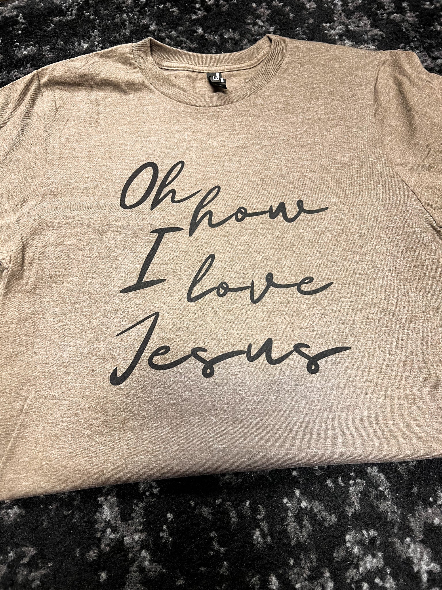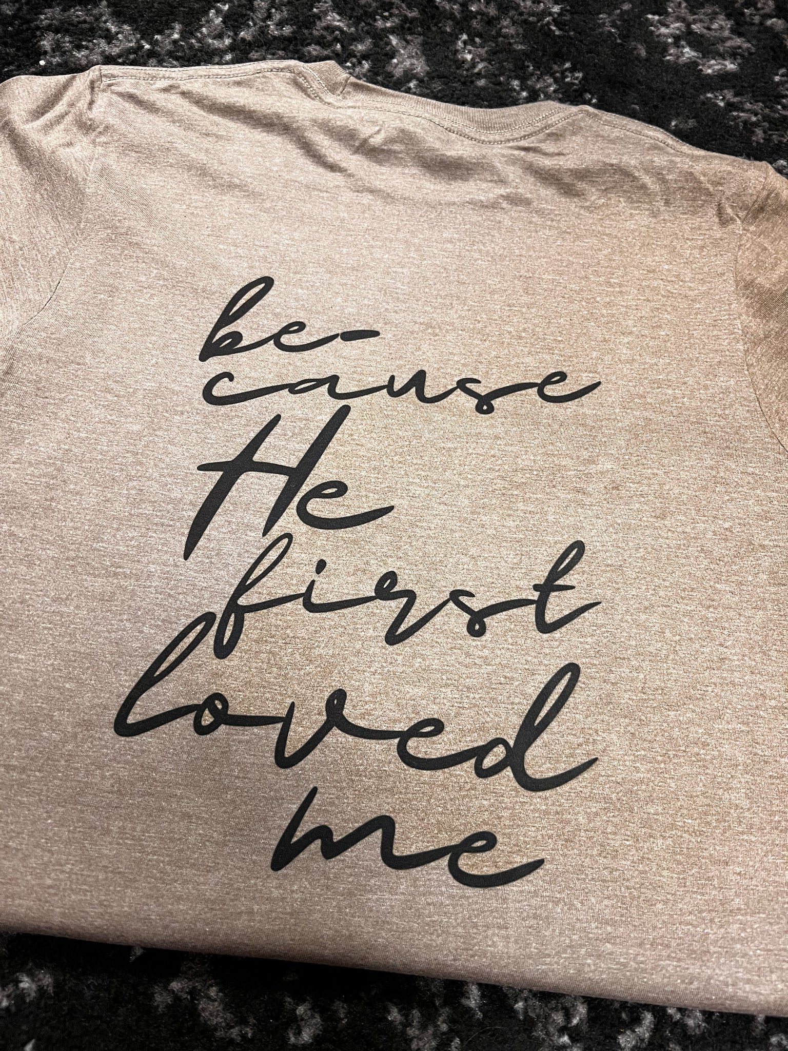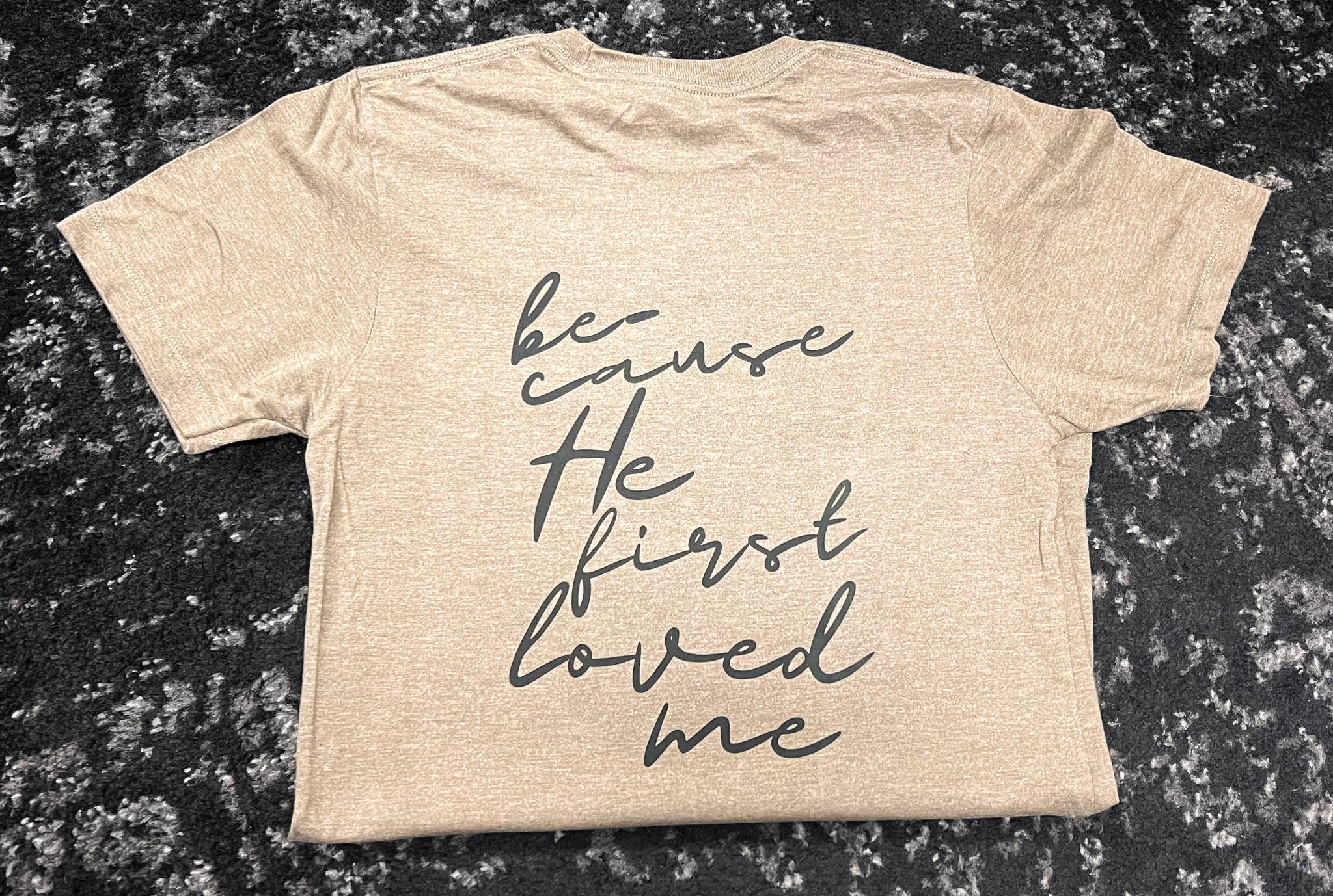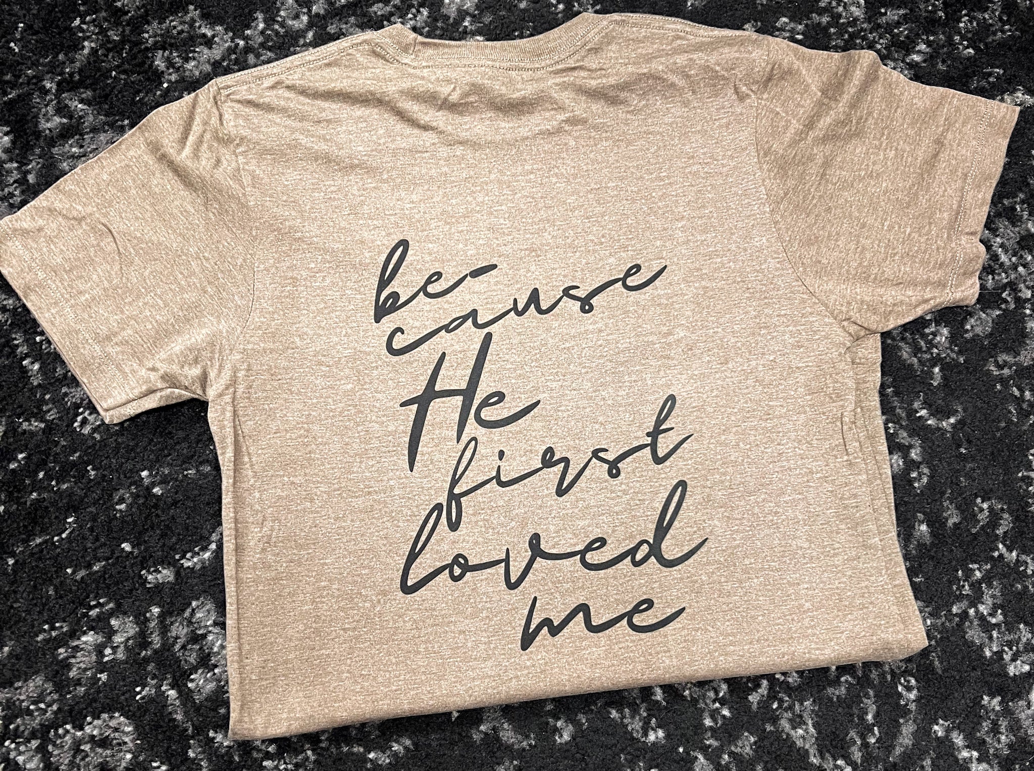 Now available in a neutral brown with black front-and-back print, the ultimate in comfort and the sweetest declaration of all! Oh how I love Jesus...because He first loved me!