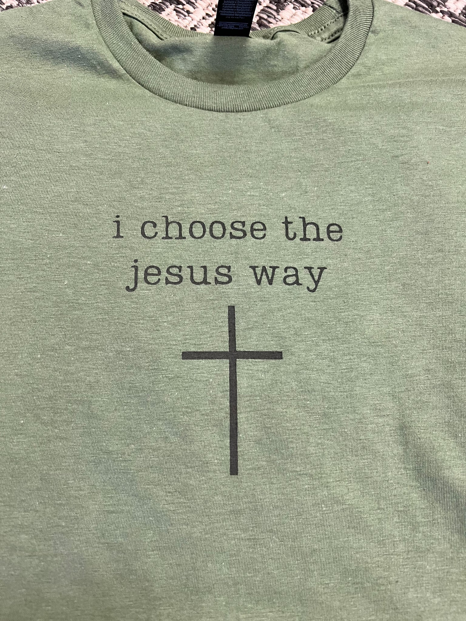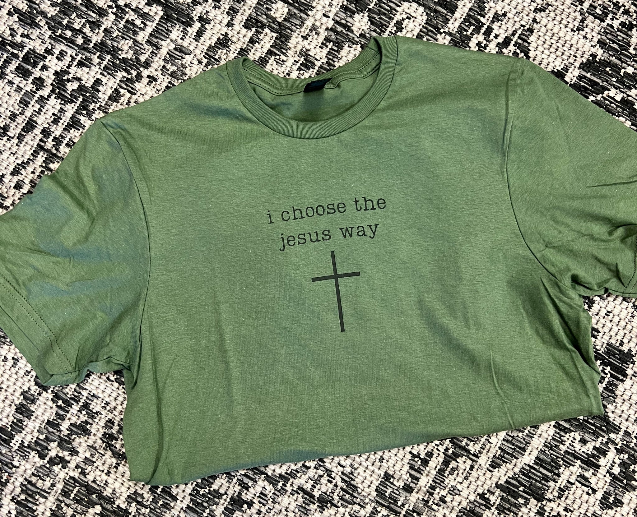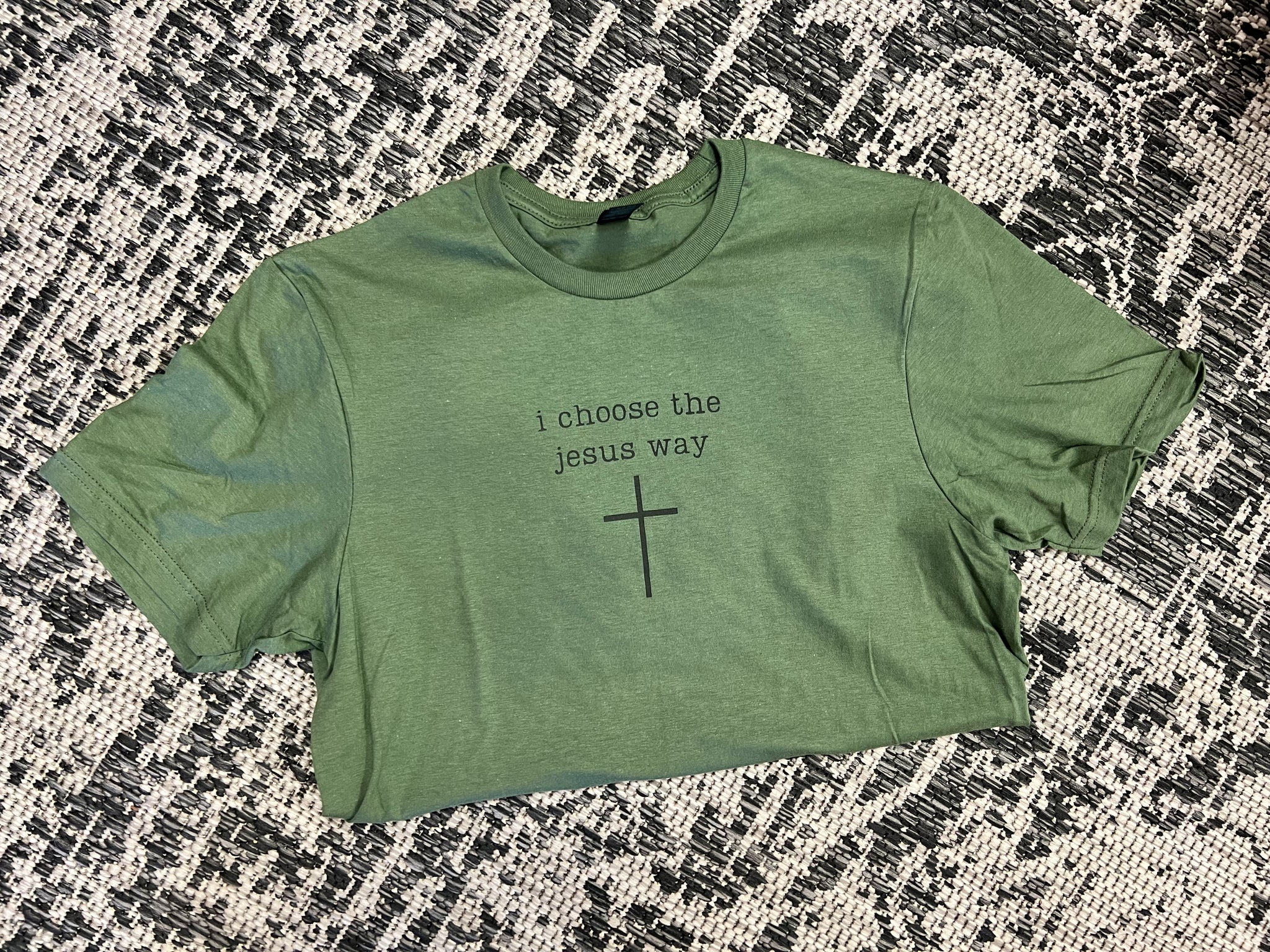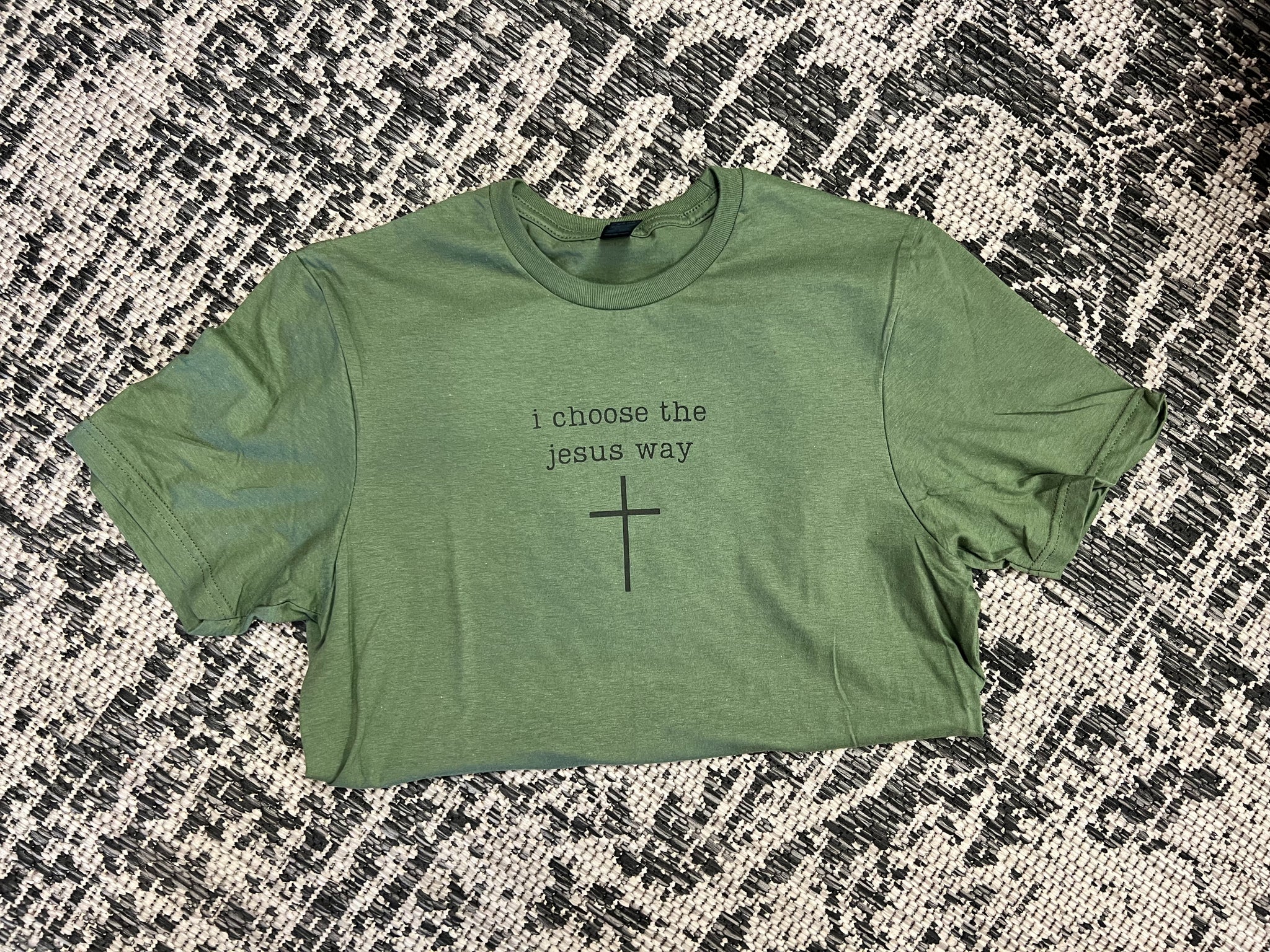 Unisex fit; true to size; 100% cotton; military green tee color with dark green silkscreen print.