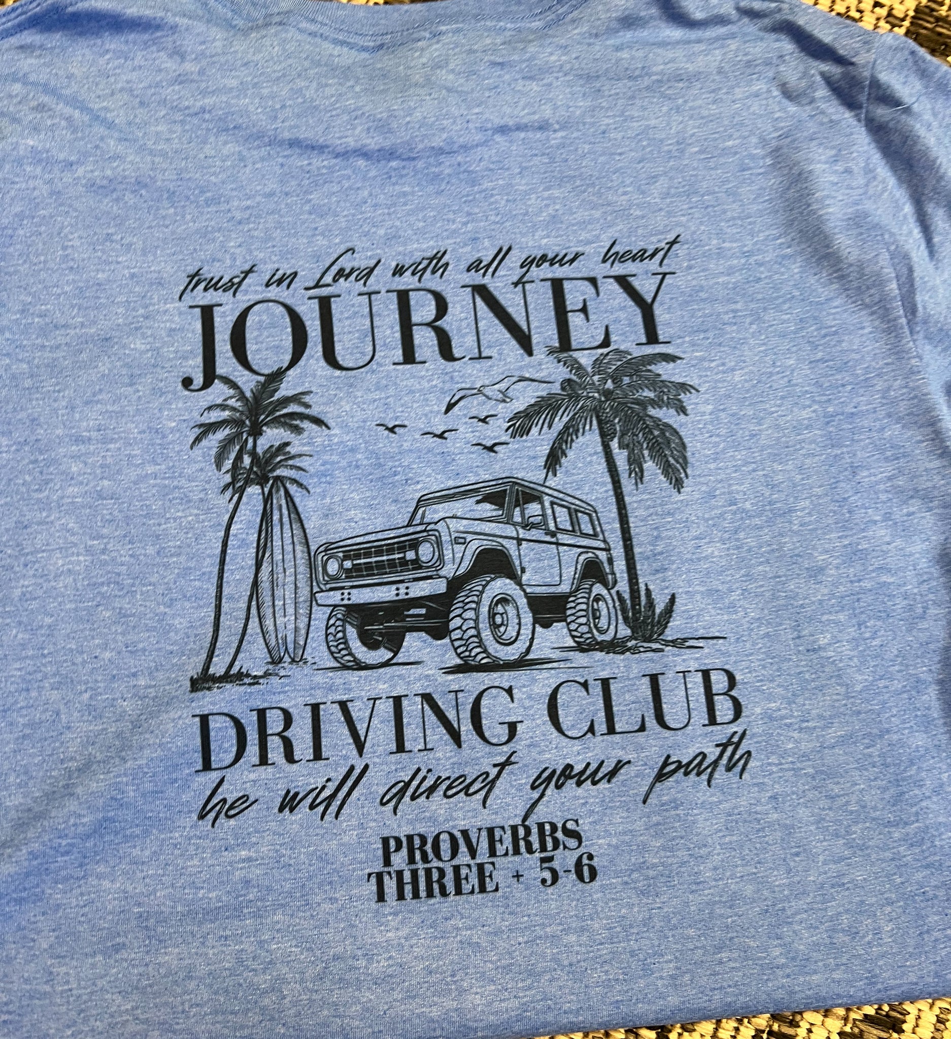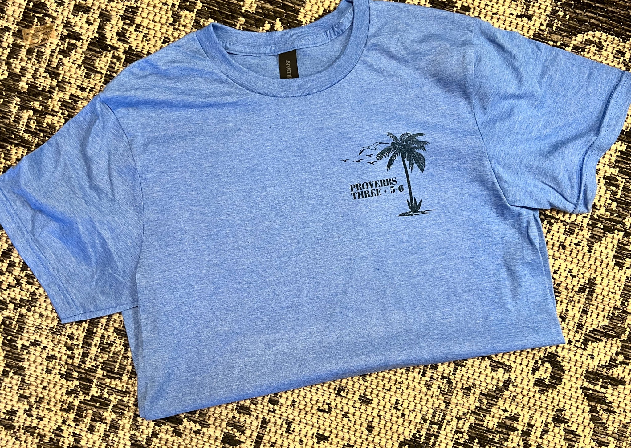 Unisex fit; true to size; 65/35 blend; heather royal tee with black front (small)/back (large) print.