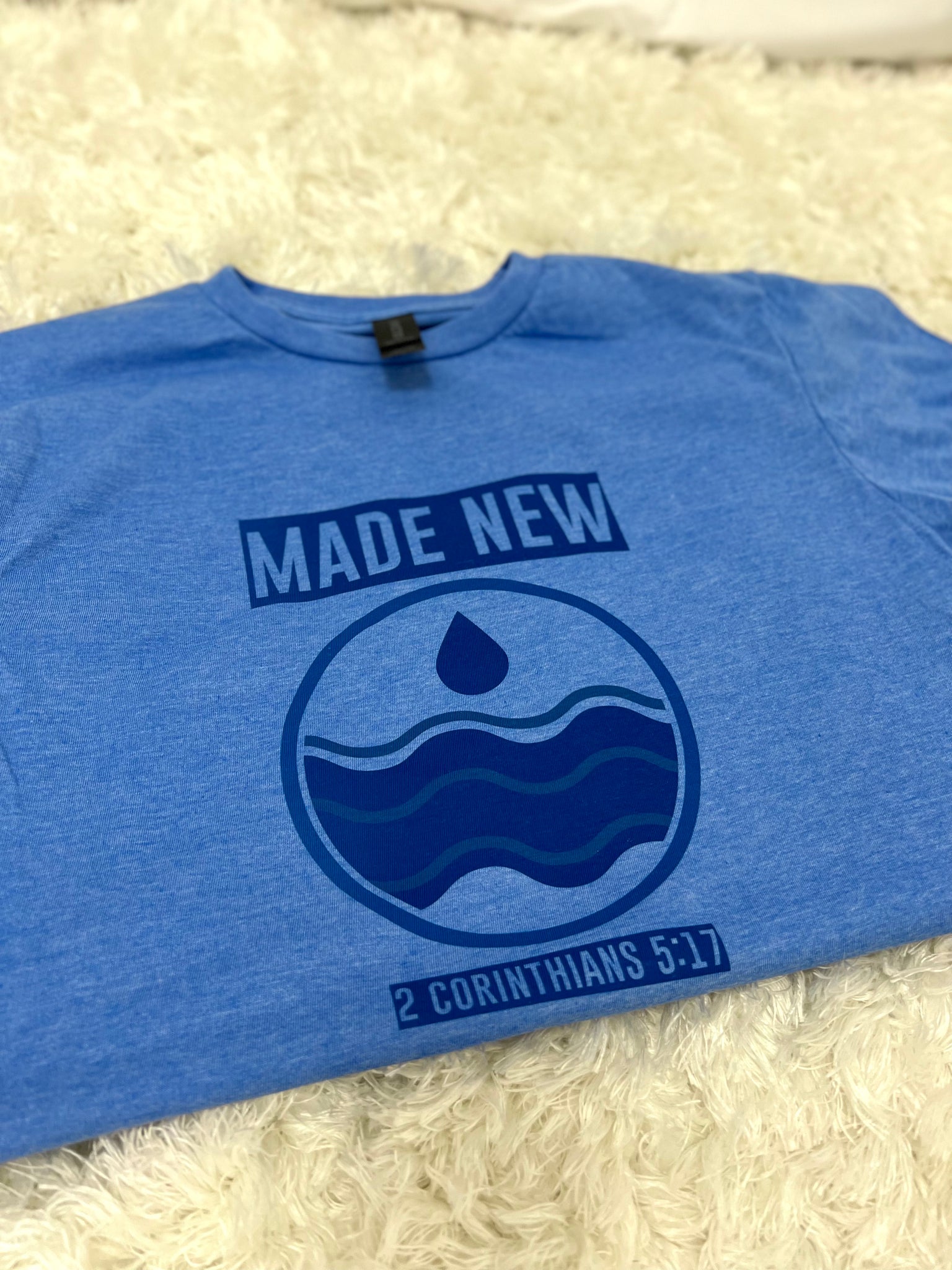 Does your church need tees for Water Baptism? Let us help! This is our standard Made New design in heather royal tee color (not see through in any way), but if you'd like your church name or custom wording added, please contact us!