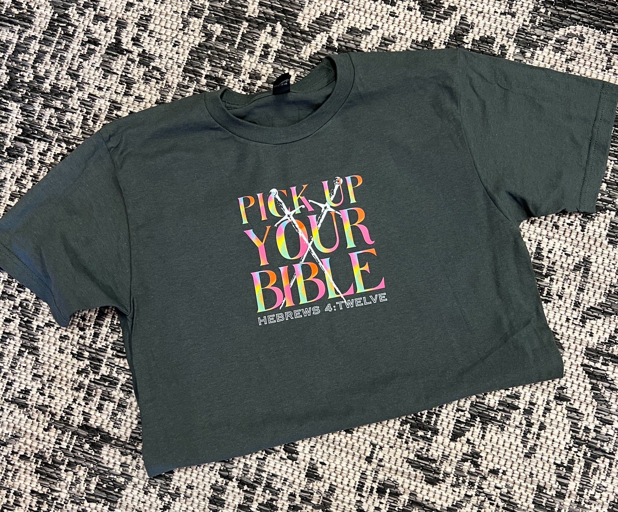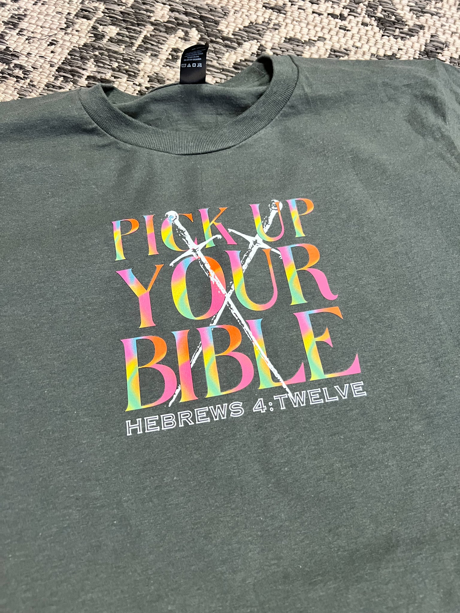 Unisex fit; 100% cotton; runs slightly large (recommend sizing down one size); charcoal tee with colored DTF print.