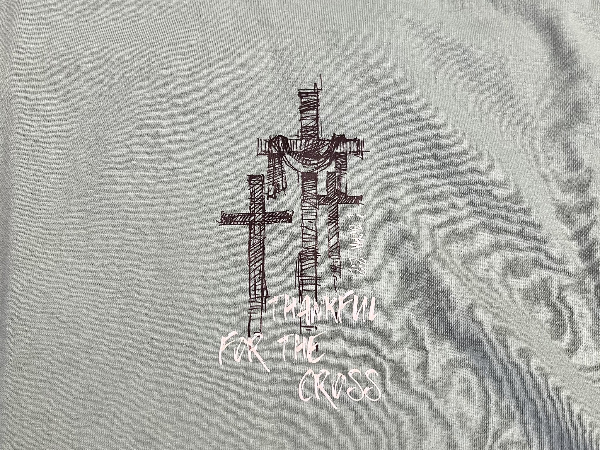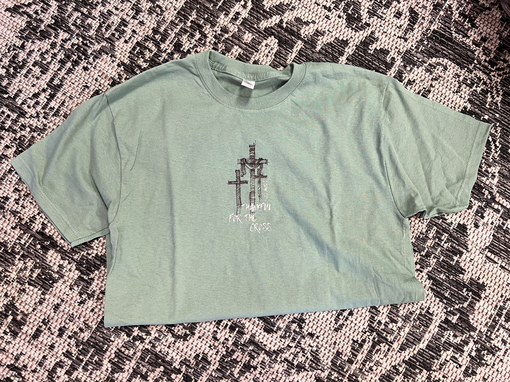 Unisex fit; true to size; 100% cotton; garment-dyed sage tee with DTF print.