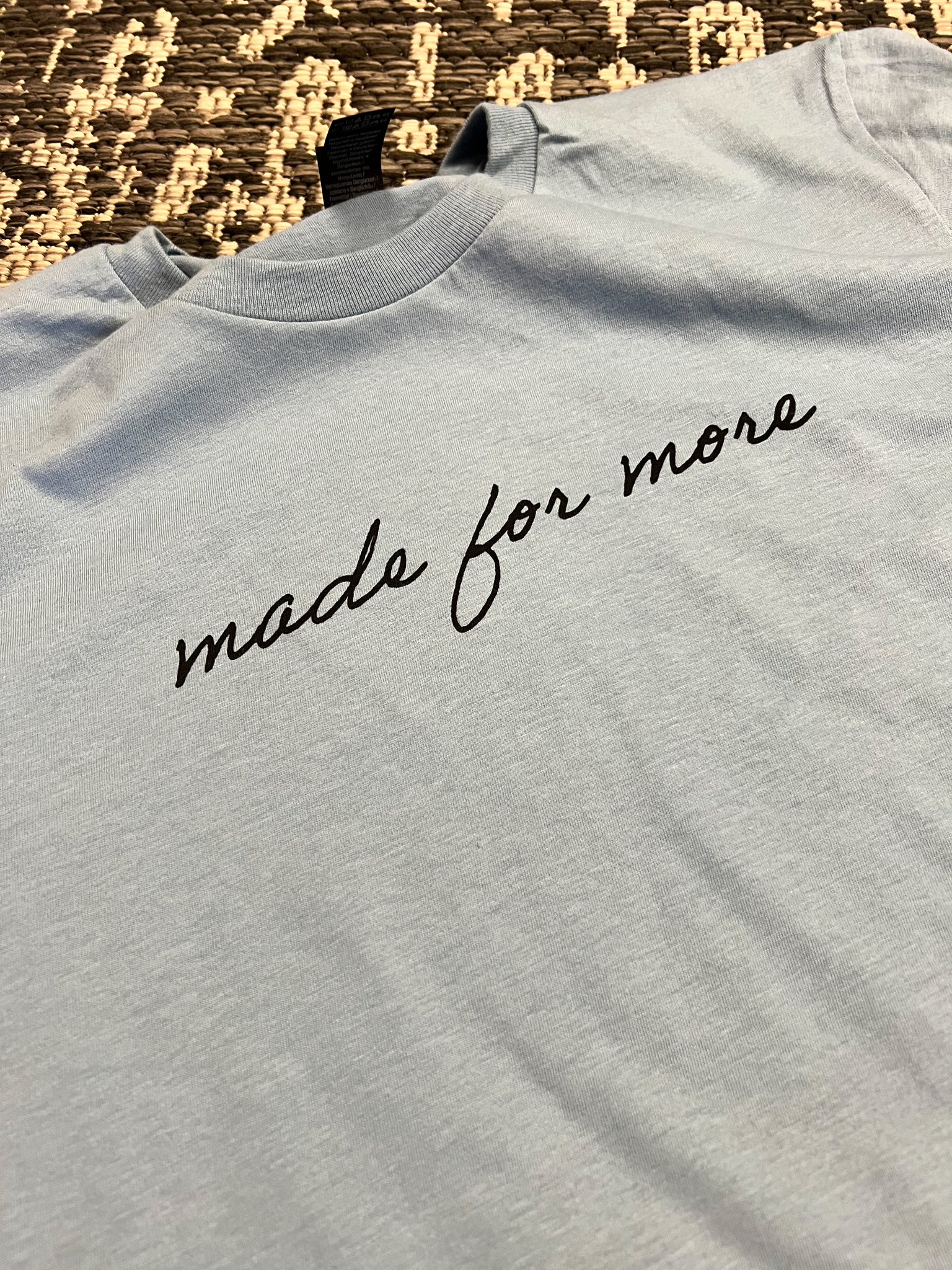 Unisex fit; 100% cotton; true to size soft tee; stone blue tee with black silkscreen handwriting print.