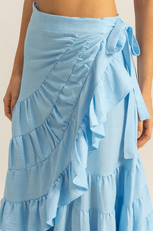 A ruffled tiered high waist skirt is a chic and feminine bottom piece that exudes style and sophistication. The high waist design cinches in at the waist, creating a flattering silhouette and elongating the legs. The tiered ruffle detailing adds texture and movement to the skirt, giving it a playful and elegant look. This skirt is perfect for both casual and dressy occasions, allowing you to easily elevate your outfit with a touch of flair and charm.