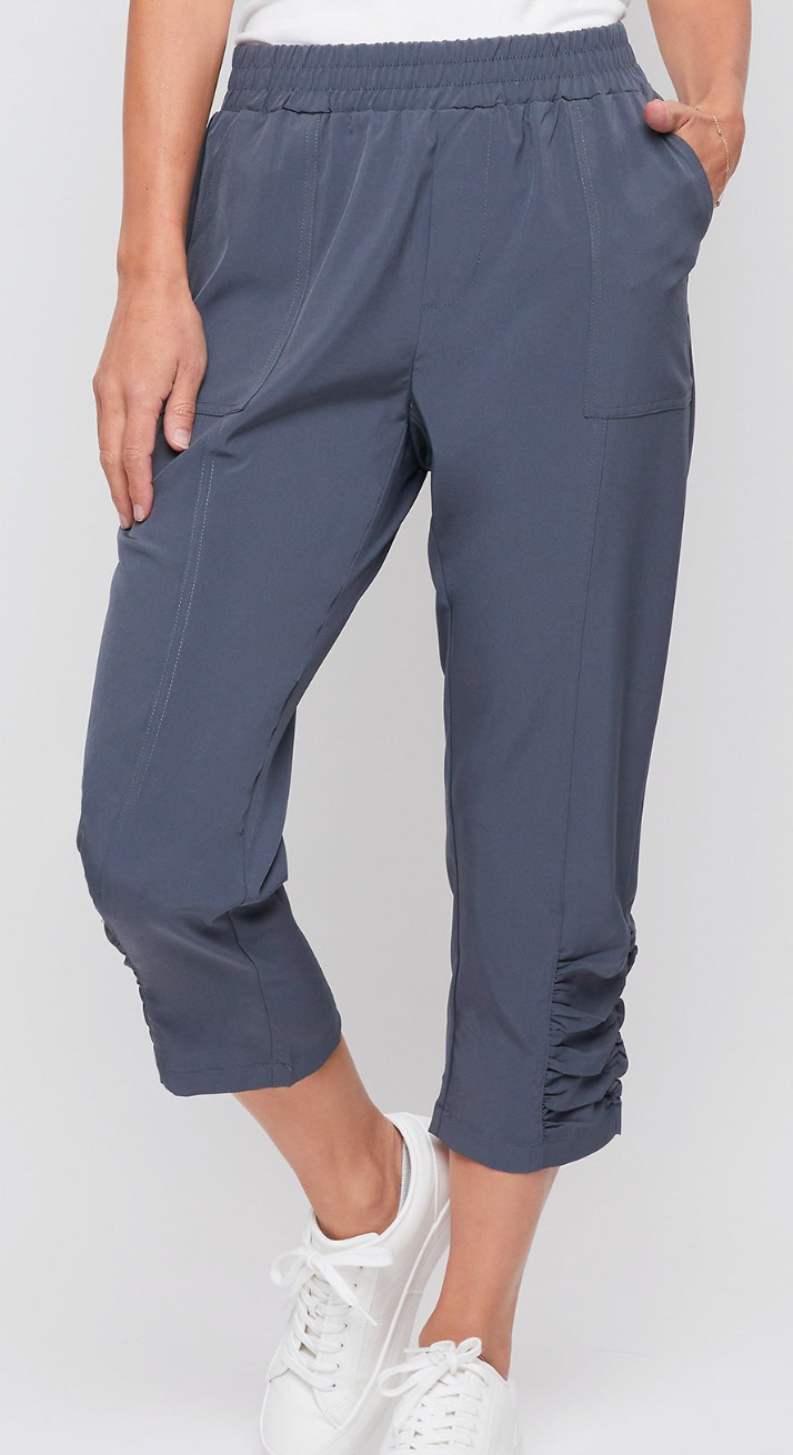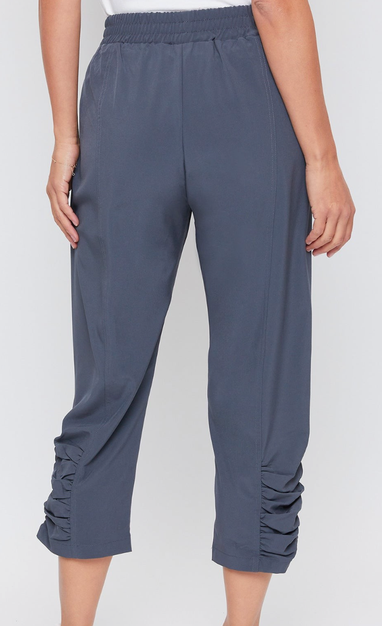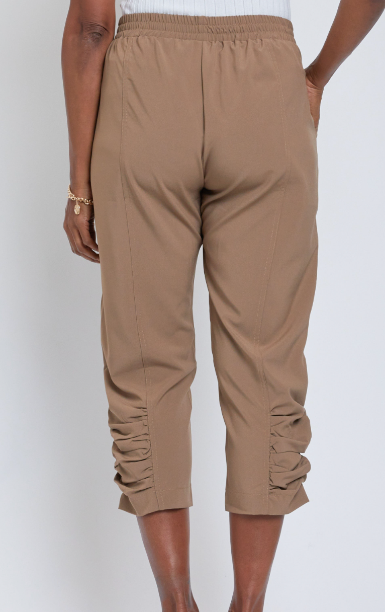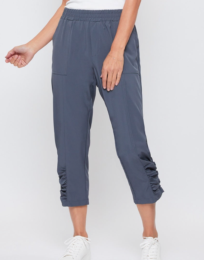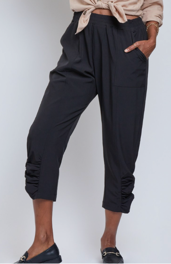 Whether you are on the go or lounging around, you'll love throwing on our Women's Elastic Waist Flood with Side Ruching Ankle Detail! Designed in a super lightweight material for breathability and easy movement. Made with an elasticized waistband for the most comfortable fit. These are a capri length and fall in between the knee and the ankle. These also have trendy ruching on the sides of the pants. Featuring two side pockets for convenience. Pair these with an easy tank or tee and some sandals or sneakers! Product Details: -High-Rise -Elastic Waistband -2 Side Pockets -Side Ruching Ankle Detail Size & Fit (based on size 8) - Inseam: 23" - Rise: 12" - Leg Opening: 16" Wash inside out. Machine wash cold. Tumble dry low.