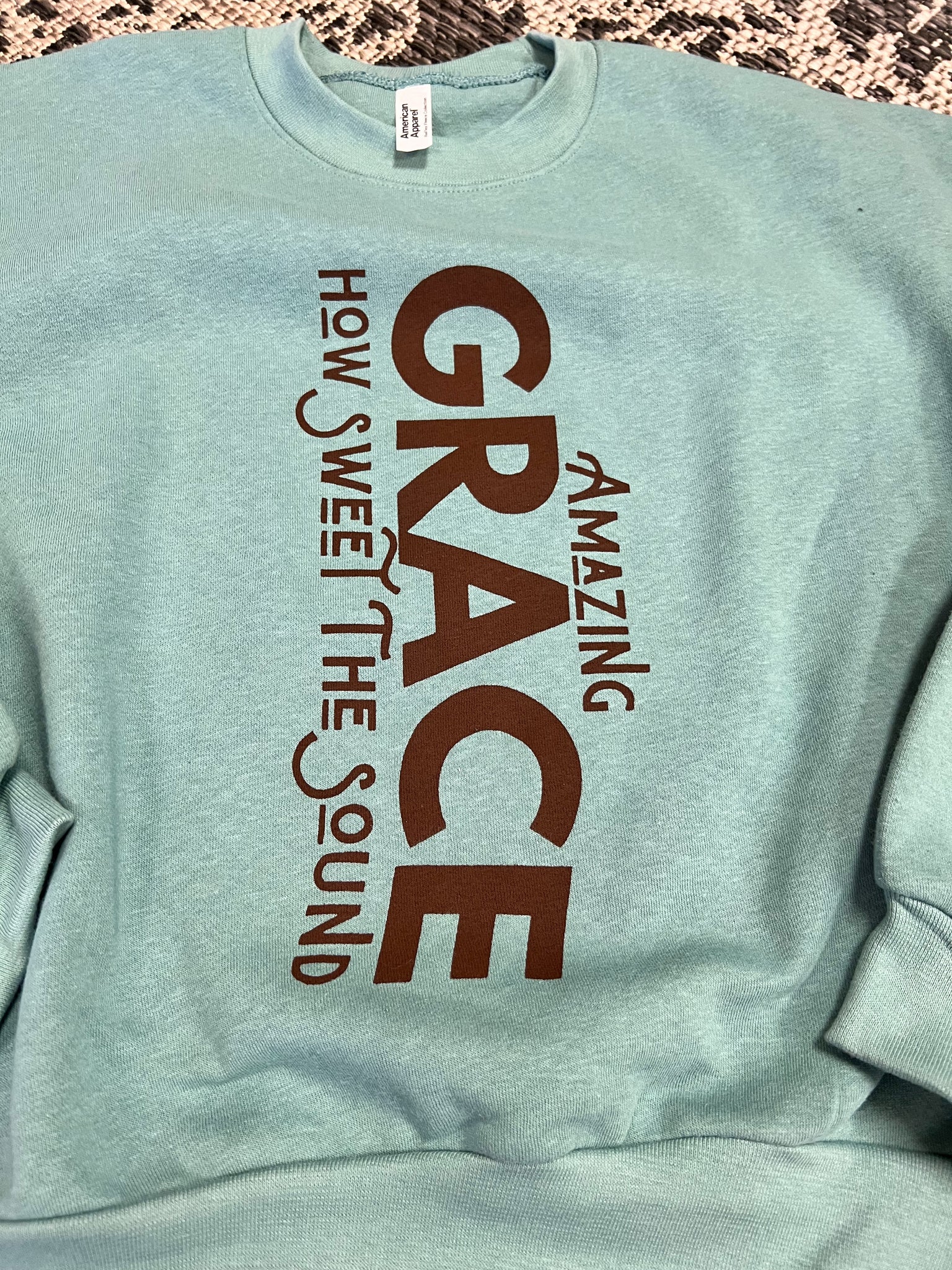 Amazing grace, how sweet the sound! A classic printed on this gorgeous fall sweatshirt with a modern boxy cut and slight ballon sleeve.