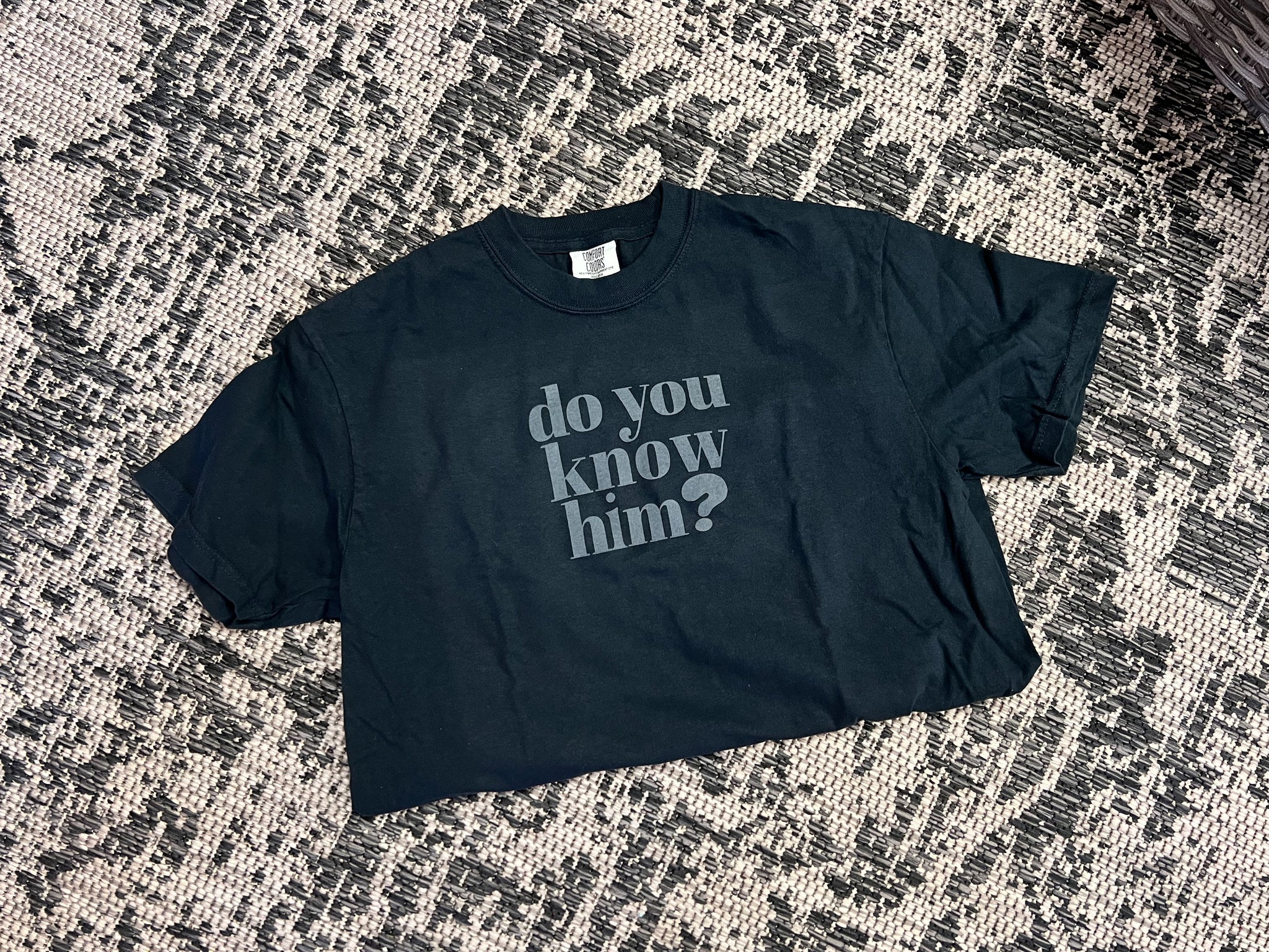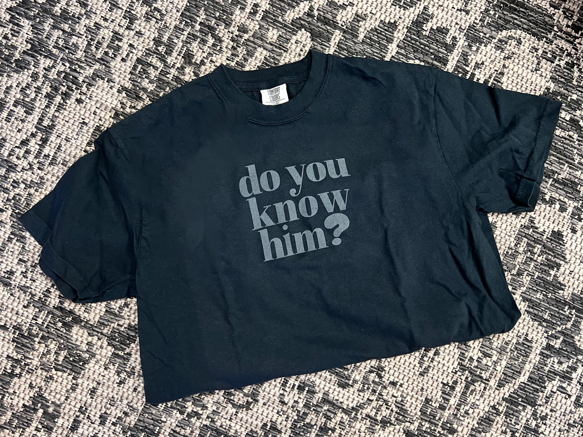 Unisex fit; true to size; 100% cotton premium brand (Comfort Colors/Comfortwash); black tee with grey silkscreen print.